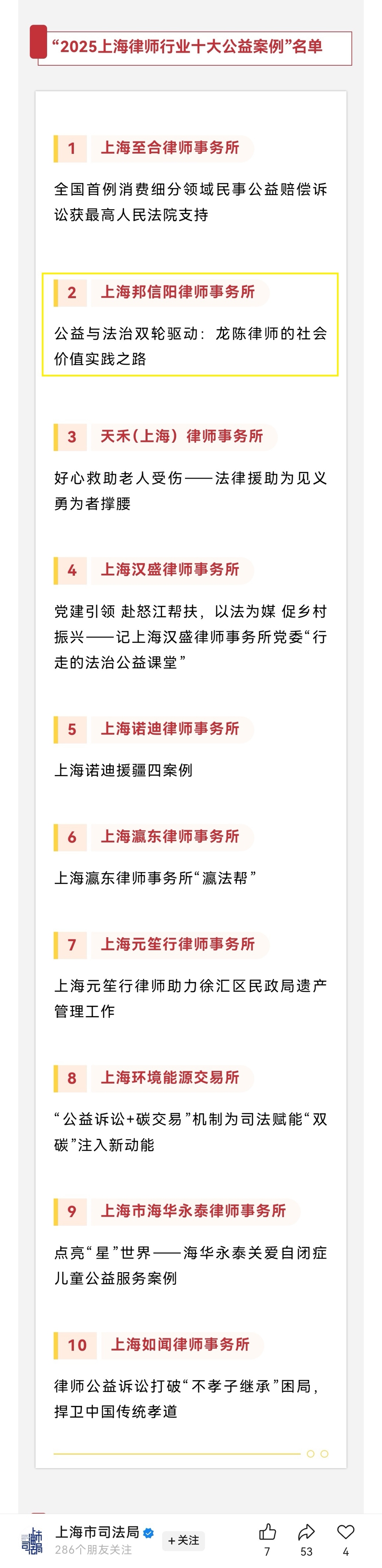 曾在去年初为《民营经济促进法》提出四条被“研究吸纳”立法建议(详细报道请见:《〈民营经济促进法〉今起实施,上海基层六条立法建议被“研究吸纳”》)的龙陈律师又传出一个好消息:其公益案例被作为“2025上海律师行业十大公益案例”之一展示交流。