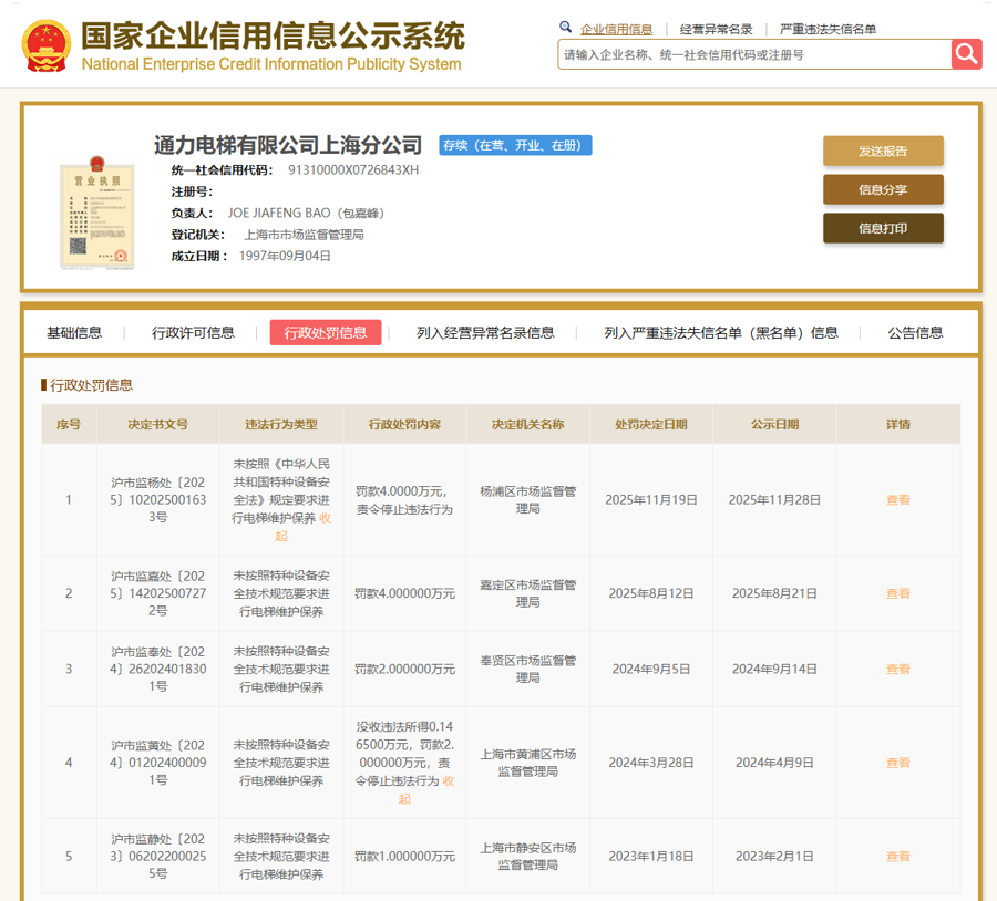 最近一次处罚可追溯到2025年8月5日,有举报反映通力电梯有限公司上海分公司未按相关法律规定和安全技术规范要求对杨浦区闸殷路盛世御龙湾小区的电梯进行维护保养。经查,当事人向上海特种设备在线系统上传虚假的维保记录,伪造了4次对该小区电梯的半月维保活动。2025年11月19日,杨浦区市场监管局对其作出行政处罚决定,罚款4万元。